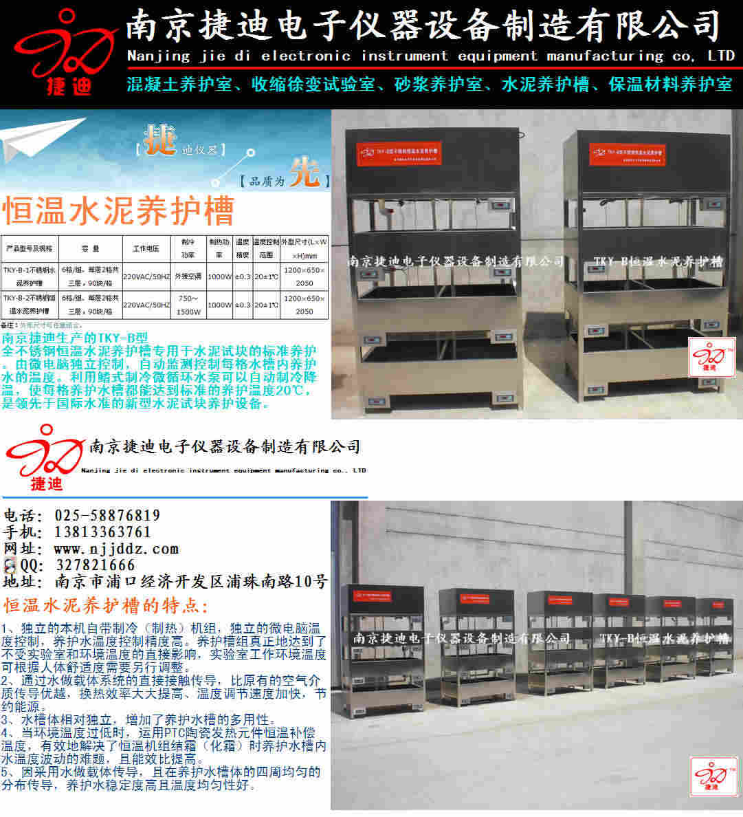 一、产品概述: 南京捷迪生产的全不锈钢恒温水泥养护槽用于水泥试块的标准养护。由微电脑单独控制,自动监测控制每格水槽内养护水的温度,实现在一个房间内每格养护水槽单独的自动制冷升温。利用鳍式制冷微循环水泵可以自动制冷降温,使每格养护水槽都能达到标准的养护温度20℃。